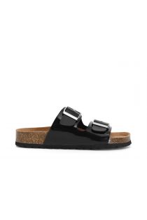 Two-strap patent leather slides with buckle on footbed.
