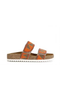 Low slider sandals with cork bottom and adjustable straps decorated with two-tone rhinestones in an ethnic design.