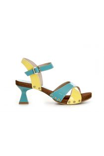 two-tone patent leather sandals with hourglass heel turquoise/yellow