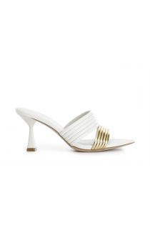 Two-tone slipper with padded bands. leather insole. with its slender shape this shoe will give you a touch of elegance and glamour. 70 mm-high reel heel.