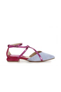 Two-tone suede ballet flats with laminated faux leather ankle strap matching suede heel.