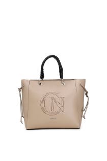 Unlined, casual look shopper embellished with braided handles and logo made with faux leather inserts on the front