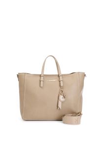 Shopping bag with a soft unlined structure with charms and removable shoulder strap with logo and rivets. single compartment and internal 200 mm open pocket. zipper closure.