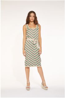 Viscose yarn dress with diagonal stripes with rounded scoop, cuffs and belt at the waist