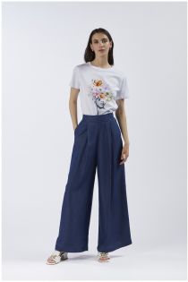 Long wide trousers with pleats in front. made of tencel denim. side pockets. elastic narrow belt in the back to increase comfort.