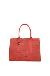 Square-shaped bag with matching handles and cafènoir accessory at the handle attachment.