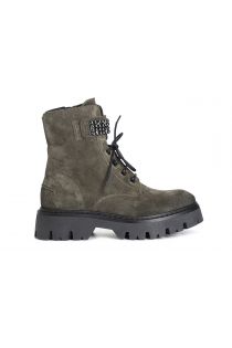 Laced ankle boot in suede with jewel accessory. zipper on the inside. the insole is in leather. the tank sole in extralight material streamlines the model and makes it hyper current.