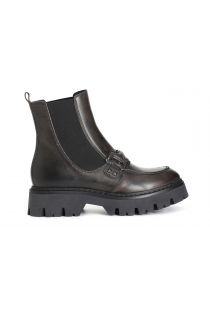 Ankle boot with brushed leather elastic and clamp on the loop. the insole is in leather. the tank sole in extralight material streamlines the model and makes it hyper current.