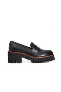Women's leather moccasin with black sole and colored welt. 60 mm high tank sole and 30 mm platform. the lining and insole are in leather.