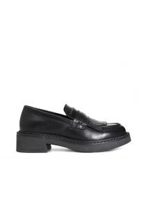 Women's leather moccasin with fringe. 50mm high heel. the insole is in leather.