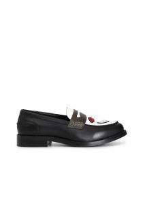 Multicolored leather women's moccasin with different patches. lining and insole are in leather. 25 mm high heel.