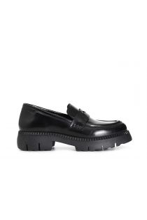 Women's leather moccasin with loop and coin accessory. lining and insole are in leather. 25 mm high plateau. 40mm heel.