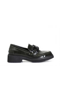 Women's moccasin in patent-effect imitation leather enriched by a clamp on the loop. the insole is in leather.