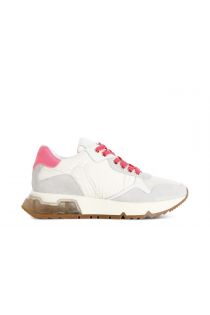White nylon and suede women’s running shoes. coloured top line and laces.