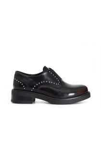 Women's brushed leatherette derby shoe with stretch panel and chrome-plated micro studs. the insole is leather.