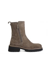 Suede ankle boot with double zip and personalized stud. 50mm high heel. the insole is in leather.