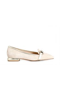 Suede leather loafers with rhinestone bit decoration. 15mm-high patent leather heel.
