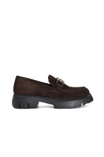 Women's suede moccasin with horsebit. lining and insole are in leather. 25 mm high plateau. 40mm heel.