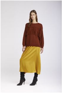 wool-alpaca blend sweater with fringed sleeves and front tobacco