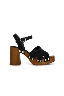 Clogs with high wooden heel and platform. suede weave and ankle strap