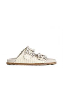 Women’s woven leather slippers with double rhinestone buckle. leather insole.