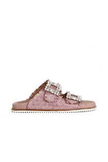 Women’s woven leather slippers with double rhinestone buckle. leather insole.