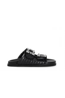 Woven leather slipper with double jewel buckle. lining and insole are in leather. comfortable 2.5 cm high fussbett.