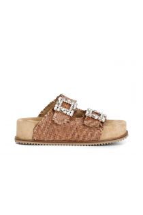 woven leather slipper with double jewel buckle, high bottom earth