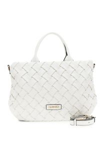 woven nappa effect handbag with metal lettering white
