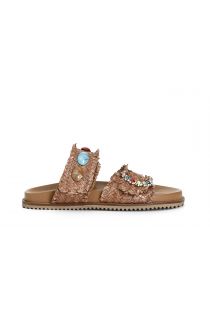Woven leather slipper with double buckle. jewel accessory. velcro closure. lining and insole are in leather. comfortable 2.5 cm high fussbett.