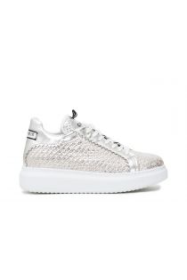 Patent woven sneakers with raw-cut zig-zag edges and inserts.